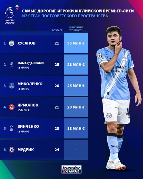 Рейтинг возглавил защитник сборной Узбекистана и «Манчестер Сити» Абдукодир Хусанов, оценённый в 35 миллионов евро. На втором месте, с ценником 28 миллионов евро, находится грузинский голкипер «Ливерпуля» Георгий Мамардашвили. Третью строчку занял 26-летний центральный защитник «Эвертона» Виталий Миколенко, его стоимость составляет 25 миллионов евро.