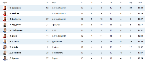 Лучшим бомбардиром КХЛ является форвард «Автомобилиста» Сергей Широков, на счету которого 17 (9+8) баллов.