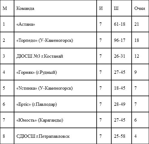 Участие в чемпионате принимало 8 команд: «Астана», ДЮСШ № 3 г.Костанай,