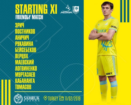 «Астана»: Ненад Эрич (В) (К) — Антонио Рукавина, Евгений Постников, Марин Аничич, Абзал Бейсебеков — Юрий Перцух, Иван Маевский, Юрий Логвиненко — Роман Муртазаев, Джуниор Кабананга, Марин Томасов.