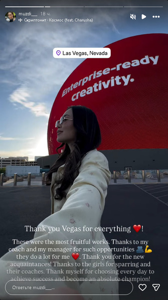 Я на пути к достижению каждой своей цели. Я знаю, что я победитель — в таком жёстком виде спорта, как бокс, выжить случайно невозможно. Поездка в Лас-Вегас — доказательство того, что я там, где и должна быть. Я верю в себя, и я сделаю так, чтобы мои родители, тренер и менеджер гордились мной. Захват начинается сейчас», — написала девушка в сторис инстаграм.