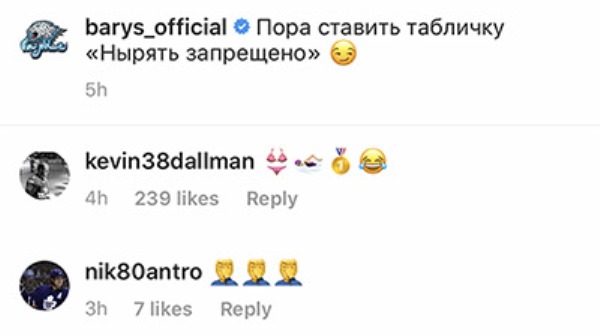 Легендарные хоккеисты «Барыса» Кевин Даллмэн и Николай Антропов оставили комментарии под видео с симуляцией нападающего «Авангарда» Сергея Шумакова на странице нур-султанского клуба в Instagram.