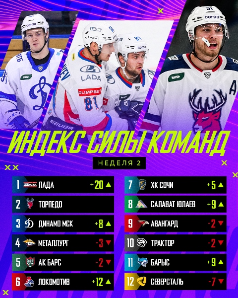 Возглавляет индекс силы «Лада», которая в нынешнем сезоне вернулась в КХЛ.
