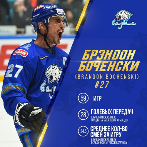 В официальной группе «Барыса» ВКонтакте опубликована статистика капитана Брэндона Боченски.