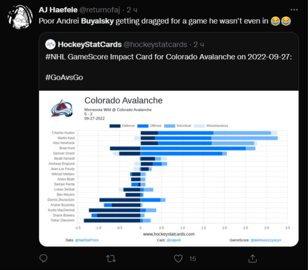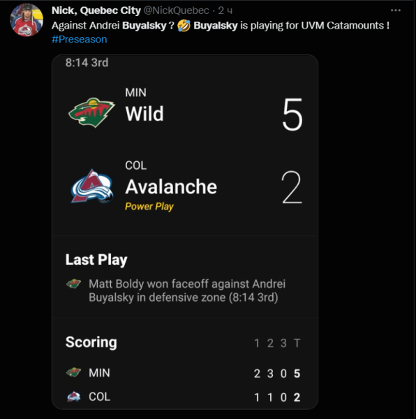 Напомним, в протоколе матча был указан казахстанский форвард Андрей Буяльский под 68 номером в «Колорадо». Однако хоккеист не выходил на лёд и попал в документ по ошибке. При этом имя Буяльского указывается в текстовой и телевизионной трансляциях.