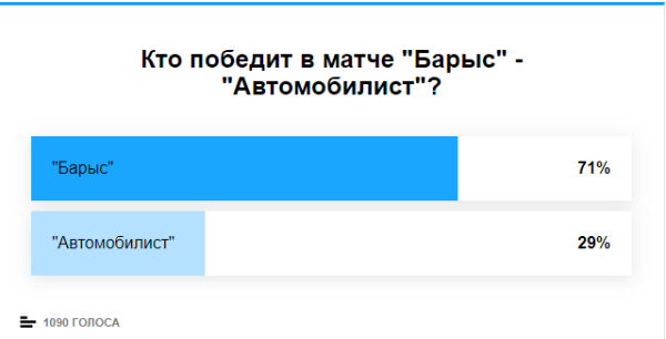 Читатели «Чемпионата» отдали свое предпочтение казахстанскому клубу. «Барыс» набрал 71 процент голосов, екатеринбургский клуб набрал 29 процентов.