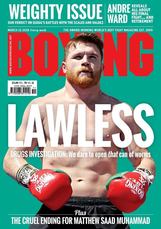 «Лицом обложки» на этот раз стал пойманный на допинге перед реваншем с Геннадием Головкиным мексиканский боксер Сауль «Канело» Альварес. Главная статья озаглавлена как «Беззаконный: мы осмеливаемся открыть эту банку с червями» и посвящена проблеме допинга в боксе.