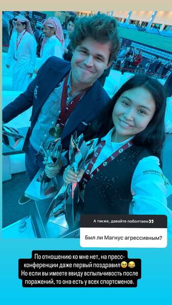 Трёхкратная чемпионка мира по блицу Бибисара Асаубаева в инстаграм прокомментировала поведение лучшего шахматиста мира Магнуса Карлсена, отметив, что лично к ней он был корректен, хотя вспыльчивость после поражений свойственна многим спортсменам, передает Sports.kz.