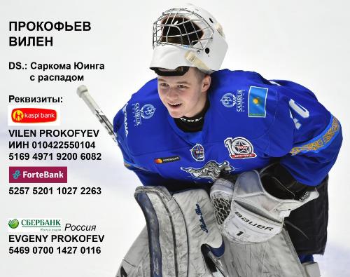 Все вырученные средства будут направлены на лечение вратаря „Снежных Барсов“, участника двух юниорских чемпионатов мира в составе сборной Казахстана Вилена Прокофьева, с диагнозом — Саркома Юинга (рак костей).