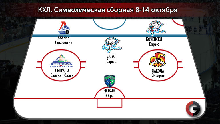 Российское издание «Спорт-Экспресс» составило символическую сборную КХЛ за 8-14 октября, куда были также включены игроки «Барыса» Брэндон Боченски и Найджел Доус.