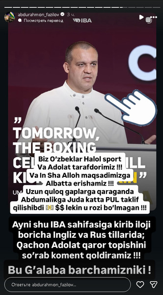 По слухам, Абдумалику предложили очень крупное денежное вознаграждение $$, но он не согласился!!!», — написал узбекистанец в своём инстаграм.