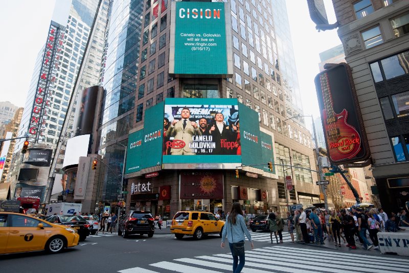 Промоутер Оскар Де Ла Хойя поделился в своем твиттере фото рекламы боя на одной из центральных улиц Нью-Йорка.
