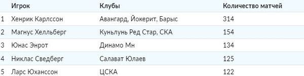 Лидер рейтинга по количеству матчей Хенрик Карлссон покинул „Барыс“, за который отыграл 5 сезонов. Если вратарь останется в КХЛ, у него будет шанс упрочить свои позиции на вершине этого топа. Двое вратарей из топ-5 в межсезонье сменили команды — Магнус Хелльберг перешёл в „Сочи“, а Ларс Юханссон занял его место в СКА. В теории в новом сезоне к этой парочке в топ-5 может присоединиться Адам Рейдеборн — новичок ЦСКА провёл 70 матчей в Лиге и, если в составе армейцев у него пойдёт игра, то вполне можно будет ждать его на пятой строчке рейтинга», — пишет КХЛ.