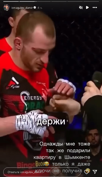 Казахский файтер опубликовал видео, где российскому бойцу ММА, после победы в поединке, вручают ключи от квартиры, но позже, герой ролика признается, что квартиру ему так и не подарили.