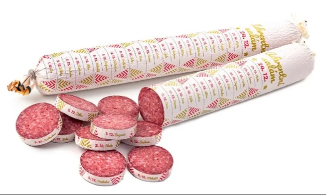 Палку салями они обернули в специальную упаковку с отмеченными делениями, которые показывают количество оставшихся дней до Рождества. По задумке производителя, раз в сутки нужно отрезать кусочек и съедать его. Изделие предлагается как для личного пользования, так и в качестве подарка.