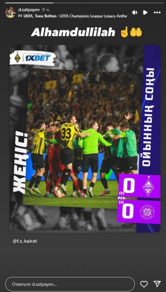 «Alhamdullilah», — написал Сатпаев в «сторис» инстаграма, опубликовав фото с итогами встречи и звучащим на фоне гимном Лиги Чемпионов.