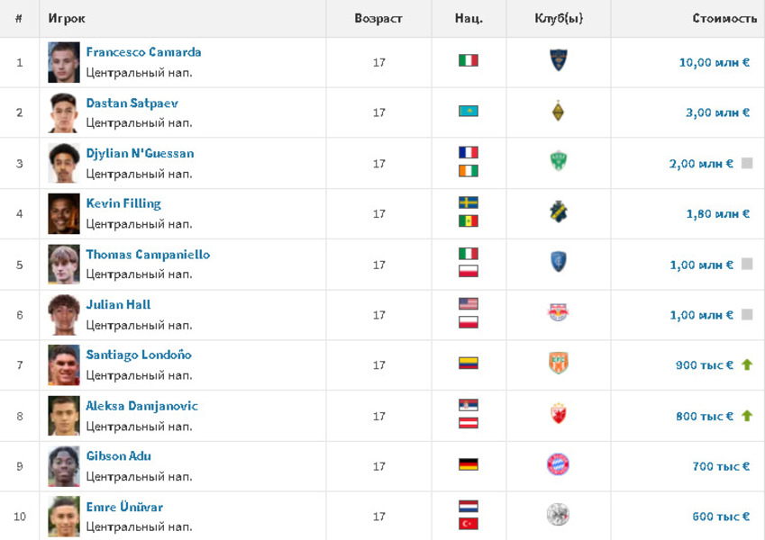 Лидером рейтинга стал центральный нападающий «Лечче» Франческо Камарда, оценённый в 10 миллионов евро. Третью строчку занял талант из французского «Сент-Этьена» Джилиан Нгессан — его стоимость составляет 2 миллиона евро. Всего в рейтинг вошли 93 футболиста со всего мира.