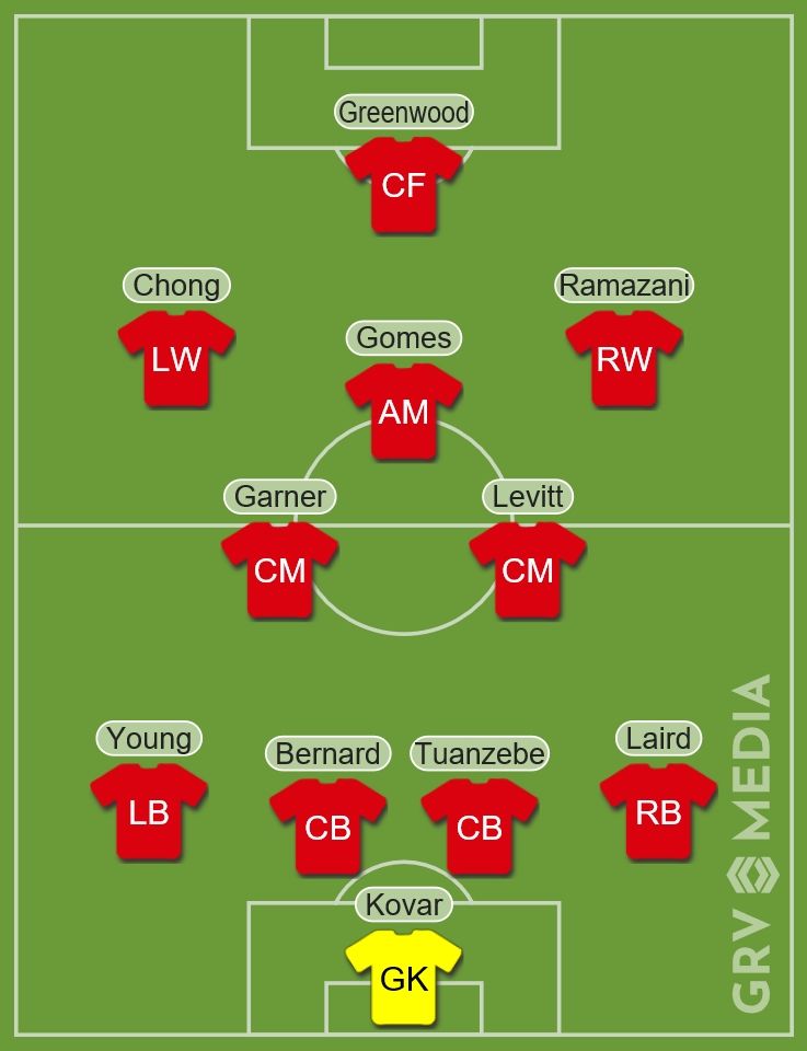 Вряд ли состав „МЮ“ будет таким, хотя это было бы большим заявлением от Сульшера. Скорее всего, Неманья Матич будет задействован в центре поля, а Диего Далот мог бы работать на фланге. К сожалению, мы, вероятно, увидим Фила Джонса на позиции центрбэка, несмотря на его печальное выступление на выходных. В воротах Серхио Ромеро был бы более надежен, чем Матей Коварж. Анхель Гомес сильно нуждается в игровом времени с первой командой, поэтому мы надеемся, что „Юнайтед“ не выберет вместо него Хуана Мату. Гарнер, Гринвуд и Туанзебе по крайней мере должны быть готовы к выходу в старте. Надеемся, что мы увидим еще как минимум троих молодых игроков», — пишется в статье.