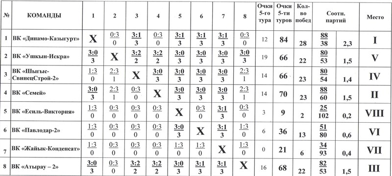 Таблица результатов 5-ти туров 23 Чемпионата Республики Казахстан по волейболу ьсреди мужских команд Высшей лиги «А»: