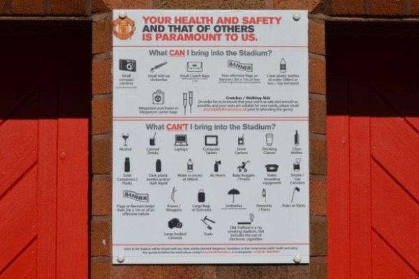 По всей территории комплекса размещены таблички с предупреждением о том, какие предметы запрещено проносить с собой на стадион. Список довольно внушительный: алкоголь, напитки в металлических банках, электронные гаджеты, видеоаппаратура, холодное оружие, стеклянные бутылки, детские коляски и другое. При этом не запрещены пластиковые бутылки без крышек объемом до 500 миллилитров, компактные фотоаппараты и атрибутика официального магазина в фирменных пакетах.