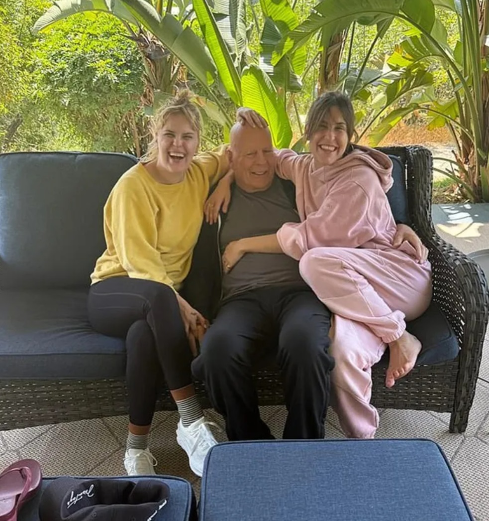 На фотографии звезда боевиков позирует вместе с дочерьми Скаут и Таллулой, сидя на диване на свежем воздухе. На другом кадре Брюс обнимает наследницу.