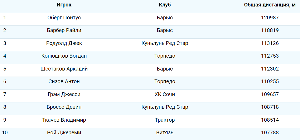 Один из статистических показателей определял общую дистанцию, преодолённую хоккеистами. Как сообщается на официальном сайте лиги, обычно по данному показателю лидируют защитники, которые разгоняют атаки своей команды, но в данный момент первые три места застолбили за собой три форварда — Понтус Оберг и Райли Барбер из «Барыса», а также Джек Родуолд из «Куньлунь Ред Стар».