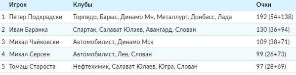 «Рекорд по количеству очков за один регулярный чемпионат: Петер Подхрадски („Торпедо“, 2008/2009) — 38;