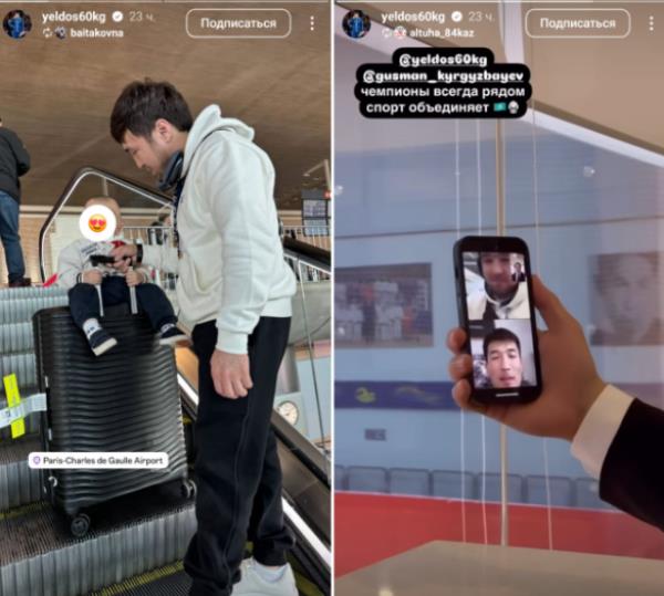 В Instagram-stories супруги спортсмена был опубликован снимок, на котором Елдос спускается по эскалатору с сыном, который сидит на чемодане.