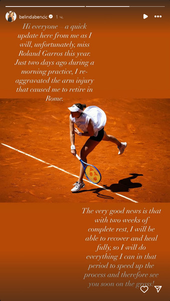 Хорошая новость в том, что двух недель полного отдыха должно быть достаточно для полного восстановления. Я сделаю всё возможное, чтобы вернуться как можно скорее и надеюсь увидеться с вами на травяных кортах!», — опубликовала в сторис экс-четвертая ракетка мира.
