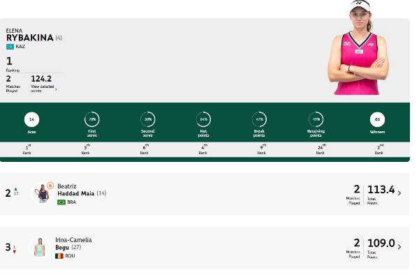 После двух выигранных матчей на «Ролан Гаррос» Рыбакина возглавила рейтинг в женском одиночном разряде по версии Infosys, представленный на официальном сайте турнира. Казахстанка набрала 124,2 очка и находится в числе лидеров сразу по нескольким статистическим показателям. Так, Рыбакина является лучшей по количеству эйсов (14) и входит в топ-6 по проценту реализации первой (78%) и второй подачи (50%), нет-поинтам (64%) и виннерсам (63).