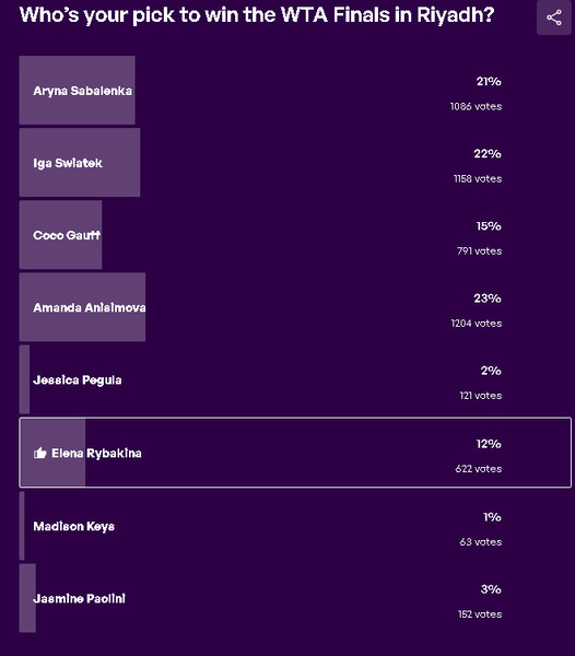 Лидерство по итогам опроса удерживает четвёртая ракетка мира, американка Аманда Анисимова, за которую проголосовали 23% респондентов. На втором месте расположилась полька Ига Швентек — 22%, а замыкает тройку первая ракетка мира Арина Соболенко с результатом 21%. За казахстанку Елену Рыбакину отдали голоса 12% участников опроса — это позволило ей занять пятое место в рейтинге фаворитов.