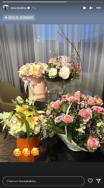 Перед стартом турнира WTA 500 в Берлине (Германия) Рыбакиной подарили сразу несколько шикарных букетов цветов. Елена в благодарность отреагировала милыми эмодзи. Снимок представлен ниже.