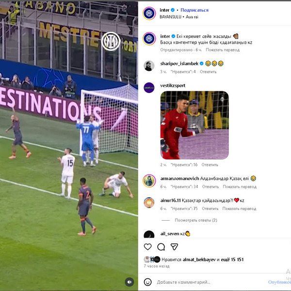 Пресс-служба «Интера» продолжает публиковать посты, посвящённые матчу Лиги Чемпионов против «Кайрата» (2:1), сообщает Sports.kz.