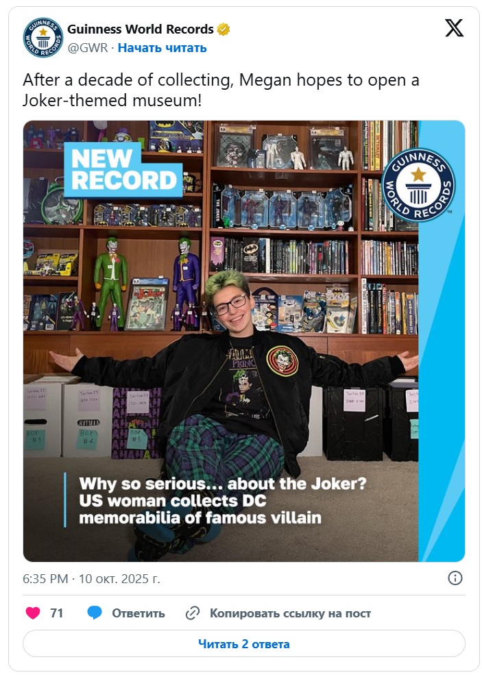 По информации портала Upi, девушка занялась коллекционированием вещей со злодеем вымышленного города DC еще в школе. Вскоре у нее накопилось множество предметов — от фигурок и комиксов до роликовых коньков, скейтборда и крышек от молочных бутылок 1966 года, пишет издание.
