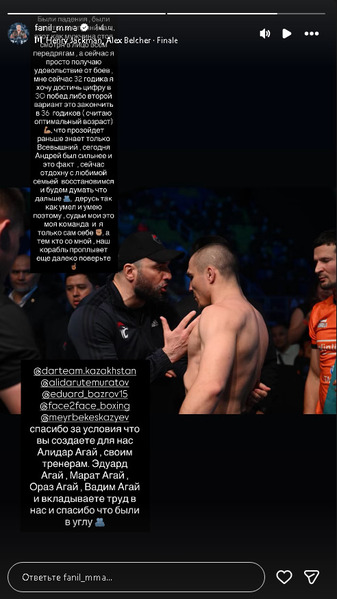 «Были падения, были взлеты. Я принимаю это как мужчина, смотря в лицо всем передрягам. А сейчас я просто получаю удовольствие от боев. Мне сейчас 32 годика, я хочу достичь цифры в 30 побед, либо второй вариант — это закончить в 36 годиков, считаю, это оптимальный возраст. Что произойдет раньше — знает только Всевышний. Сегодня Андрей был сильнее, и это факт. Сейчас отдохну с любимой семьей, восстановимся и будем думать, что дальше. Дерусь так, как умел и умею. Поэтому судьи мои — это моя команда, и я [отвечаю] только сам себе. А тем, кто со мной: наш корабль проплывет еще далеко, поверьте», — написал файтер в сторис инстаграм.