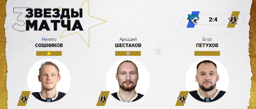 Казахстанский нападающий владивостокской команды Аркадий Шестаков в этой встрече набрал 2 (1+1) очка и был признан второй звездой. Экс-игрок сборной Казахстана Егор Петухов стал третьей звездой матча. На его счету также 2 (1+1) очка.