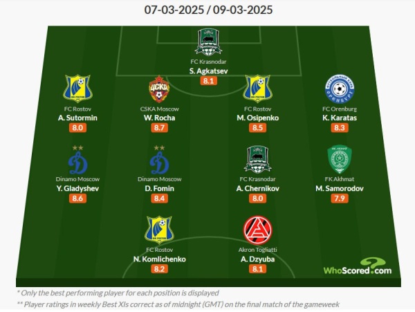Статистический портал WhoScored на своем официальном сайте представил символическую сборную 20-го тура Российской Премьер-Лиги, передает Sports.kz со ссылкой на KazFootball.kz.