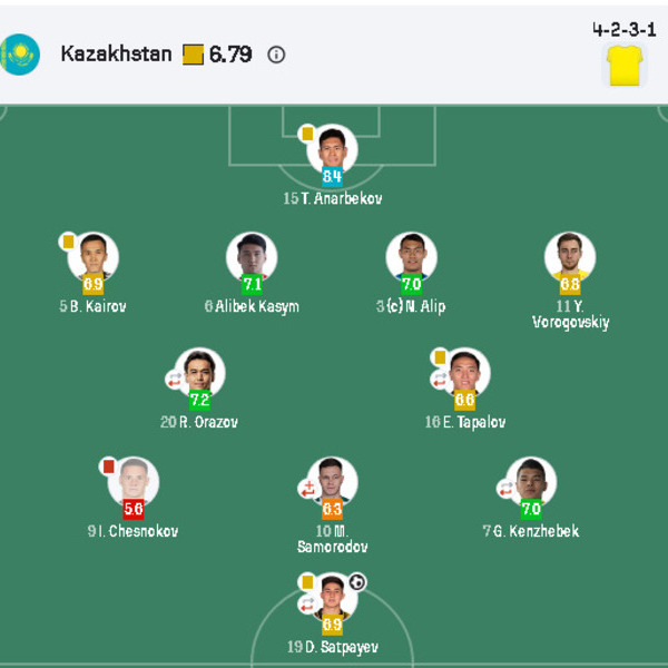 Наивысшую оценку среди игроков сборной Казахстана получил голкипер Темирлан Анарбеков, совершивший восемь сейвов и в ключевые моменты сохранивший ворота в безопасности. Его игра была оценена в 8,4 балла. Самую низкую оценку получил полузащитник Ислам Чесноков (5,6 баллов), который на 79-й минуте получил красную карточку и оставил команду в меньшинстве. Автор единственного гола сборной Казахстана Дастан Сатпаев получил 6,9 балла, а полузащитник Галымжан Кенжебек — 7,0 баллов.