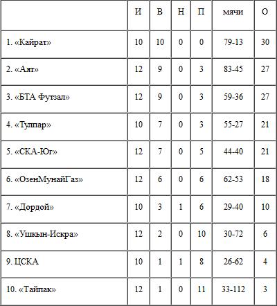 И во втором матче «Кайрат» в Уральске не имел проблем с «Тайпаком», выиграв 10:4. Хет-трик в составе алматинцев оформил Лео. По два мяча забили Николай Пенгрин и Андре. Также успел отличиться вратарь Галимжан Космухамбетов. Напомним, что в первой игре в ворота «Тайпака» гол забил другой вратарь — Виталий Халявин. После того, как счет стал 9:1 в пользу «Кайрата», игроки гостей попросту перестали играть, чем трижды воспользовались хозяева, у которых дубль оформил Джумагали Алибаев. Алматинский «Кайрат» в стартовых десяти матчах, одержал десять побед.