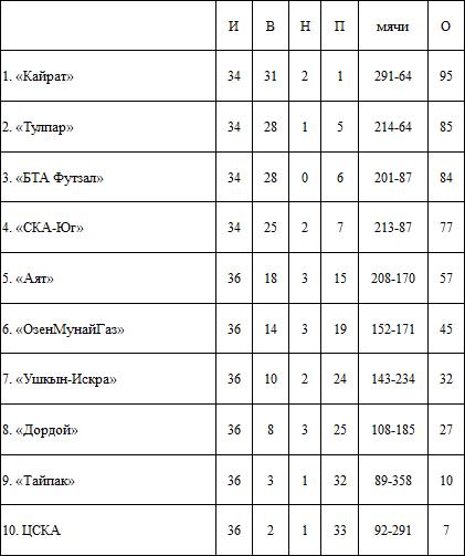 В заключительном, 18-м туре определился чемпион страны. Им в 10-й раз, причем кряду, стал алматинский «Кайрат». Определились и обладатели медалей. Им стали карагандинский «Тулпар» и алматинский «БТА Футзал». Кому достанется серебро, а кому бронза, решится в перенесенных матчах.