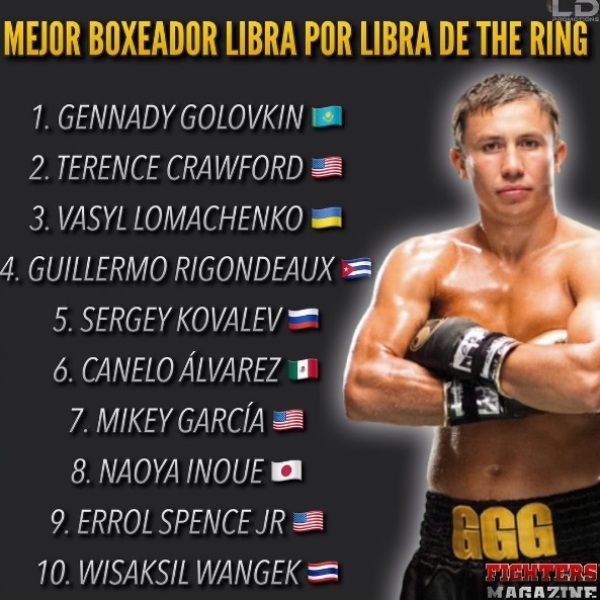 Казахстанский боксер Геннадий Головкин (37-0-1, 33 КО), владеющий поясами WBA (Super), WBC, IBF и IBO в среднем весе занял в нем первое место.