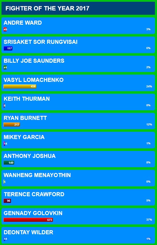 Твиттер британского сайта WorldBoxingNews.net опубликовал промежуточные итоги голосования читателей по определению лучшего боксера 2017 года, сообщает Sports.kz.