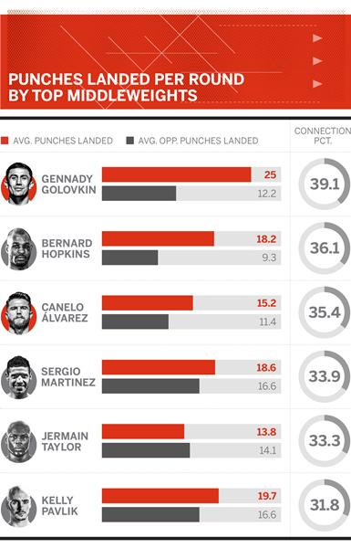 При этом Головкин лидирует по среднему показателю нанесенных в цель ударов (25 против 12,2 пропущенных), обойдя Хопкинса (18,2; 9,3) и Альвареса (15,2; 11,4).
