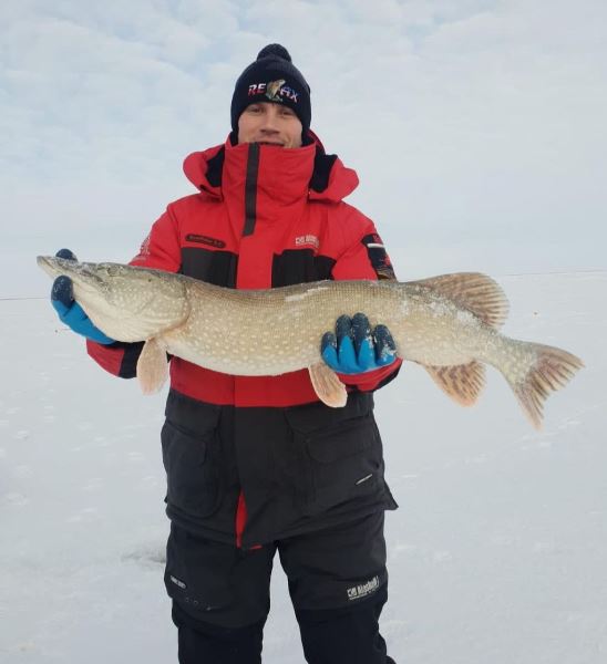 В кадре хоккеист запечатлён с гигантской щукой, которая едва помещается у нег в руках.