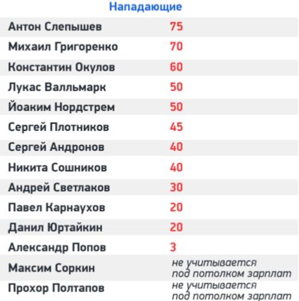 Самым дорогим игроком армейцев стал нападающий Антон Слепышев — 75 миллионов за следующий сезон, второй по размеру зарплаты — вернувшийся из НХЛ Михаил Григоренко (70 миллионов). Сведберг получить 35 миллионов за сезон и делить 13-е место Адамом Рейдеборном и Артемом Блажиевским.