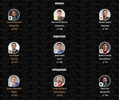 У форвардов на первом месте игрок «Барыса» Никита Михайлис — 553 голоса. Далее идут Стефан Да Коста (ЦСКА, 342) и Илья Усов («Динамо» Минск, 286).