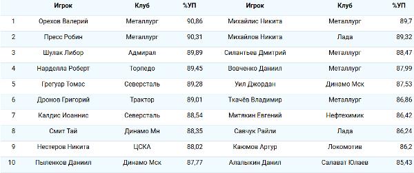 «Для игроков оборон установлен минимум в 300 точных передач, а для нападающих — 250. Спустя месяц точность передач в среднем по Лиге упала, среди защитников показатель выше 90% показывают Валерий Орехов и Робин Пресс из „Металлурга“. Тройку замкнул Либор Шулак из „Адмирала“, который поднялся с восьмой строчки. Среди форвардов лидирует Никита Михайлис из „Металлурга“, а совсем рядом с ним Никита Михайлов из „Лады“», — пишет сайт.