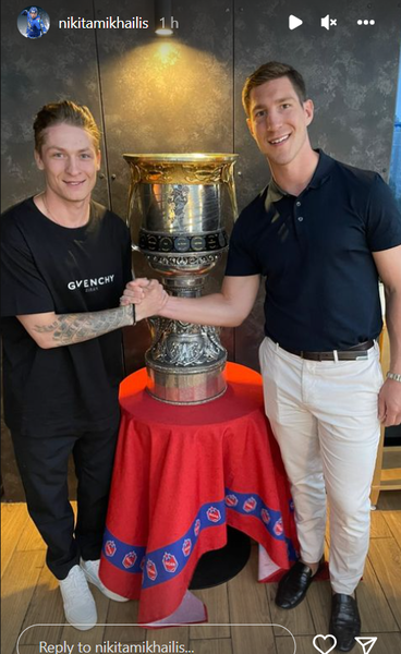 Обладатель Кубка Гагарина в составе московского ЦСКА хоккеист сборной Казахстана Даррен Диц и нападающий национальной команды и астанинского «Барыса» Никита Михайлис показали фотографию с главным кубком КХЛ, передает Sports.kz со ссылкой на инстаграм форварда.