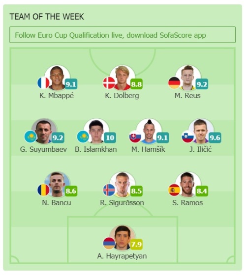 По данным аналитического портала SofaScore игроки Национальной сборной Казахстана Бауыржан Исламхан и Гафуржан Суюмбаев вошли в символическую сборную четвертого тура квалификации ЕВРО-2020.