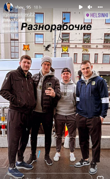 В разделе сторис на своей странице в социальной сети казахстанец опубликовал фотографию с тремя другими игроками сборной: Паволм Акользиным, Романом Старченко и Кириллом Панюковым, подписав фотографию: «Разнорабочие».